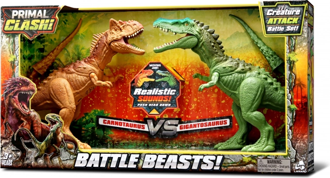 Podajte se na prazgodovinsko pustolovščino z Primal Clash! Dino bitka set Carnotaurus proti Gigantosaurus. Ta set vsebuje dve interaktivni figuri dinozavrov s premično glavo in čeljustmi ter realističnimi zvočnimi učinki.
