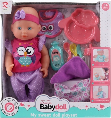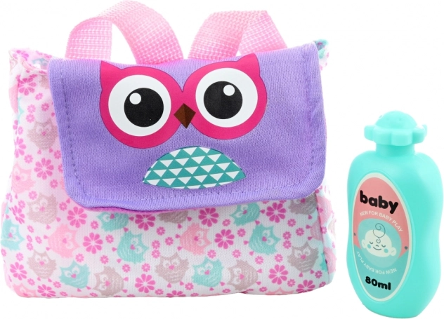 Del paketa je praktična oprema: duda, steklenička, krožniček in žličke za hranjenje ter ljubek tekstilni nahrbtnik z motivom sove za prenašanje dodatkov. Punčka bo tako idealna spremljevalka za igro mamice doma in na poti.