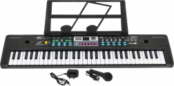 V paketu: klaviature, napajalni adapter, mikrofon, stojalo za note. Napajanje iz omrežja (adapter priložen) ali 6× AA 1,5 V (niso priložene).