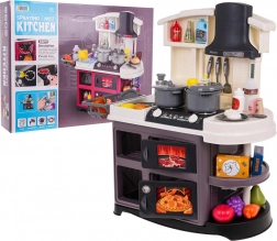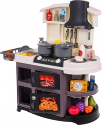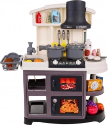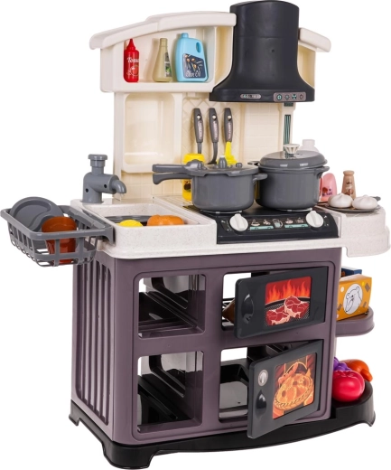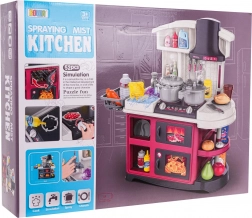 Ta plastična kuhinjica je odlično izdelana in opremljena z vsem, kar otroci potrebujejo za igro kuhanja. Ob obračanju gumbov se oglasijo realistični zvoki kuhanja in pečenja, gorilniki pa zasvetijo. Z dodajanjem nekaj kapljic vode nastane nežna hladna para, ki še okrepi občutek pravega kuhanja. Pipa resnično teče, zato lahko otroci v koritu “pomivajo” posodo.