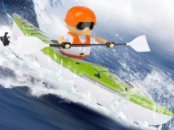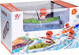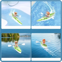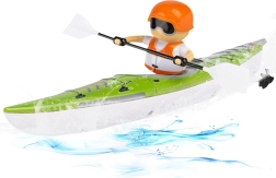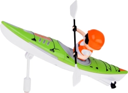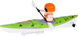 Figurica v rešilnem jopiču in čeladi premika vesla v ritmu gibanja kajaka, kar spodbuja domišljijsko igro otrok.