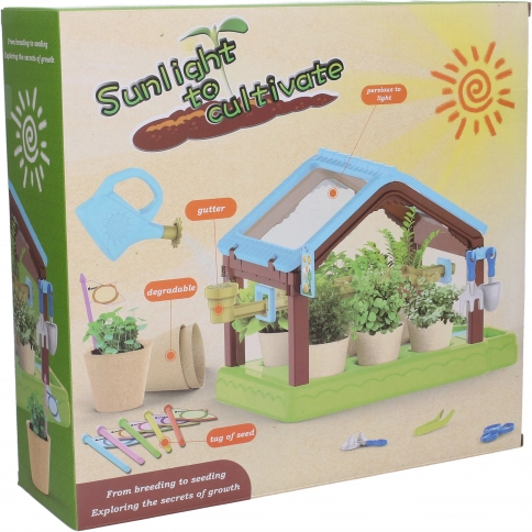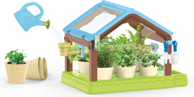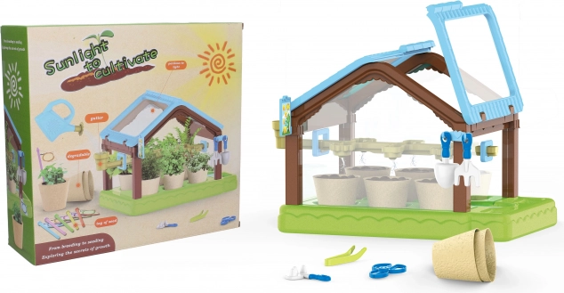 - rastlinjak, 6 cvetličnih lončkov, 4x zemlja, semena, 6 oznak, kombinirka, pinceta, škarje, lopatica, grabljice, luknjevec