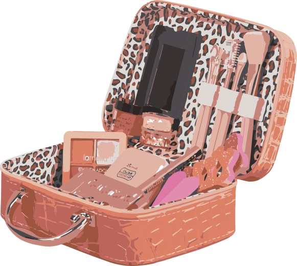 Kovček s kozmetiko. Velikost 19 cm. Vsebuje ogledalce, umetne nohte, glos za ustnice, rdečilo za lica, senčila za oči, pilice za nohte, komplet čopičev, balzam za ustnice, črtalo za oči, bleščeče okraske.