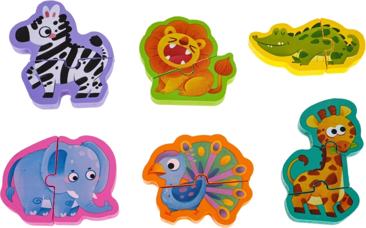 V kompletu so lesene figurice živali: zebra, lev, slon, pava, žirafa in krokodil. Odlično za samostojno igro ali skupno ustvarjanje s starši.