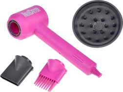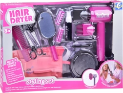 Del kompleta je otroški fen na baterije z izmenljivimi nastavki za različne stile, škarje, glavnik, zrcalce, sponke, navijalke in razpršilo – vse v nežnem rožnatem dizajnu za maksimalno veselje pri igri. Odlična ideja za darilo za vsako malo frizerko.