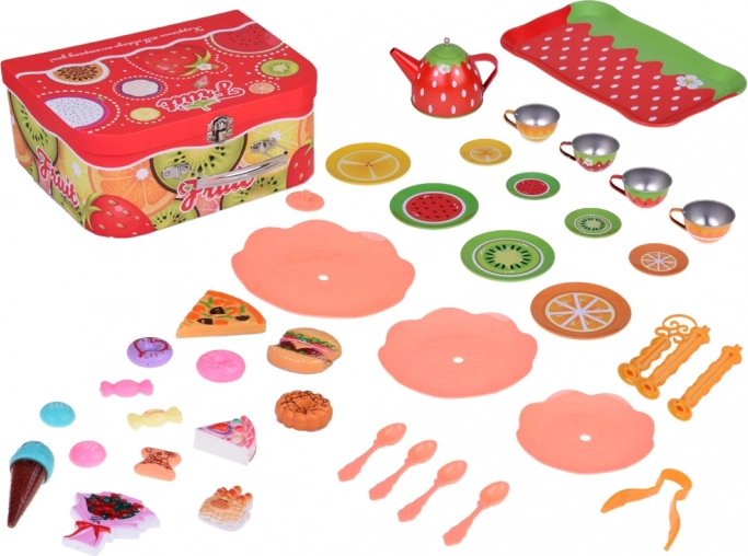 Otroški čajni set s sadnim motivom je izdelan iz trpežne kovine (čajnik, skodelice, podstavki, pladenj) in dopolnjen s plastično tridelno etažero ter bogatim naborom sladkih in slanih dobrot. Vse je spravljeno v privlačnem kovčku – idealno za pospravljanje in prenašanje.