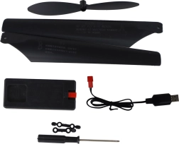 - RC helikopter, daljinski upravljalnik, USB polnilec, nadomestni propeler, izvijač, navodila za uporabo, originalna embalaža