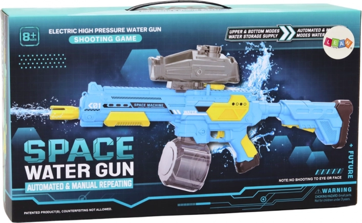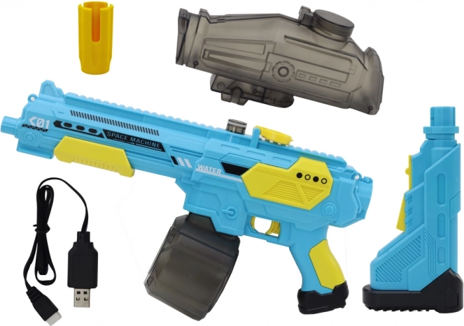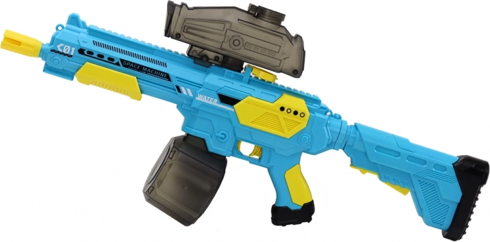 Akumulatorska vodna pištola M416 v modro‑rumeni barvi. Samodejno streljanje, kapaciteta 500 ml, domet 9 m, baterija 7,4 V. Idealna za otroke od 8 let.