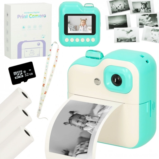 Naprava je zasnovana za otroke: ima preprosto upravljanje, odporno ohišje in kompaktne mere (9 × 4,5 × 9,5 cm). Za odmore od fotografiranja poskrbijo MP3 predvajalnik in 5 iger. Pisana vrvica olajša nošenje, tri rolice papirja pa poskrbijo, da ga še dolgo ne bo zmanjkalo.