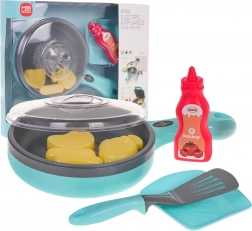 V paketu najdete ponev s prozornim pokrovom, lopatko, krožniček, stekleničko »kečapa« in živila (riba, zrezek, hrenovke) – vse pripravljeno za domišljijsko pojedino.