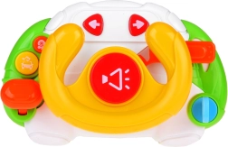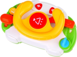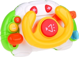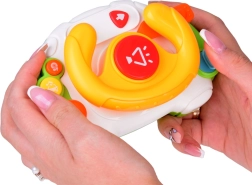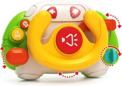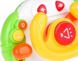 Ta barvit otroški volan spodbuja domišljijo, senzorični razvoj in usklajenost rok. Otroci lahko obračajo volan desno in levo, uporabijo ključ za »zagon« motorja ter vklapljajo smernike s pristnimi zvoki. Vesele melodije in svetlobni učinki ohranijo pozornost malih voznikov doma in na poti.