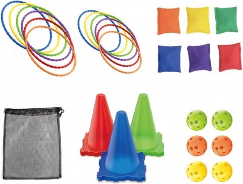 Otroška igra z metanjem obročev in košaric z žogicami v mreži
