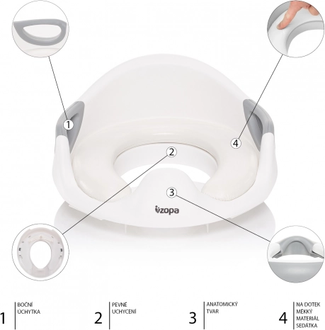 Za otroka je prehod na klasično stranišče pomemben korak. WC sedež ZOPA Coach ta proces olajša zahvaljujoč svoji ergonomski zasnovi in univerzalnosti. Sedež preprosto namestite na večino vrst stranišč brez posebnega orodja, protidrsne točke na spodnji strani pa zagotavljajo stabilnost.
