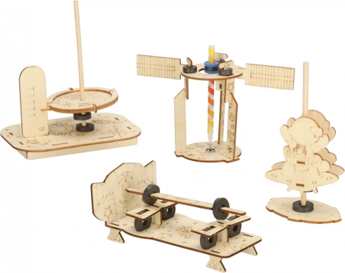 Z laserjem natančno izrezani leseni deli se sestavijo brez lepila in orodja. Otroci se med samo gradnjo naučijo osnov mehanike, prenosov in ravnotežja.