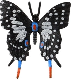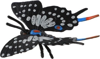 Ta kakovosten model metulja prikazuje značilne poteze rodu Papilio – elegantna črna krila z belimi lisami ter nežnimi modrimi in rdečimi poudarki. Zaradi realistične izdelave je odličen dodatek za ljubitelje narave, šole in muzeje.