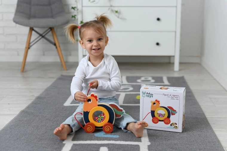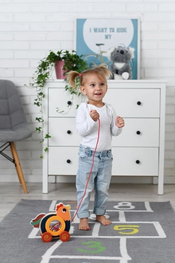 Ta barvita lesena igrača spodbuja razvoj motoričnih spretnosti ter koordinacijo rok in nog preko vlečenja.