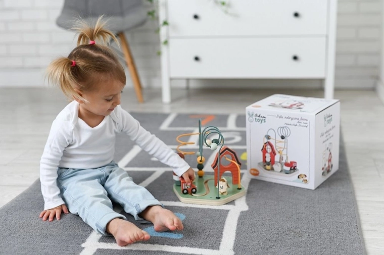Labirint je ergonomsko zasnovan za majhne roke ter dodatno krepi samostojno igro in ustvarjalne sposobnosti z živahnimi barvami in raznolikimi oblikami kroglic. Zahvaljujoč robustni leseni osnovi in kovinskim žicam je zelo trpežen.