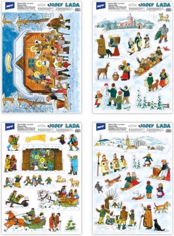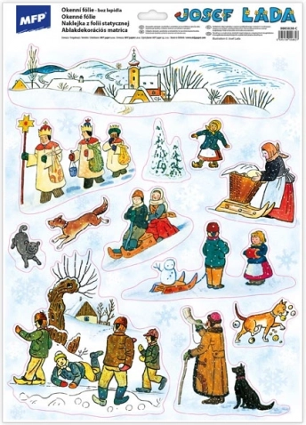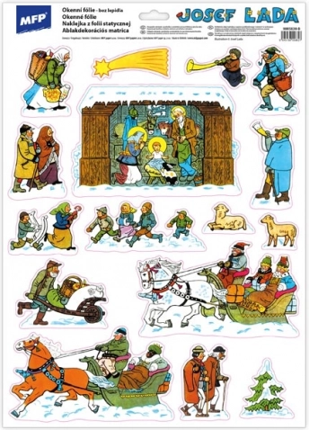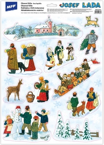 Božične okenske folije z motivi Josefa Lade. Elektrostatske, brez lepila, večkrat uporabne za steklo in druge gladke površine. Čar tradicionalnih božičev.