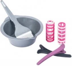 Posodica, čopič, klipsne in navijalke spodbujajo domišljijo pri “barvanju” in oblikovanju pričesk. Varno, brez nereda.