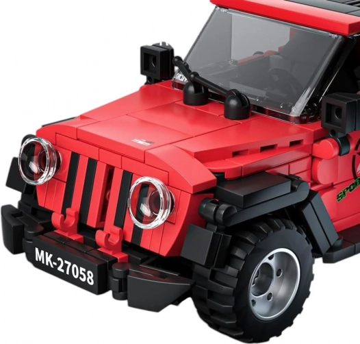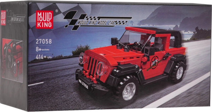 Stavebnica MOULD KING: rdeče terensko vozilo iz 414 kosov iz trpežnega ABS. Vključuje nalepke, slikovni priročnik in prozorno vitrino. Starost 8+.