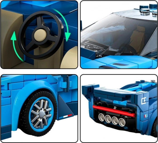 Model ponuja vrtljiv volan, zavijalna kolesa, ročno odpirajoča se vrata in višinsko nastavljiv zadnji spojler – za avtentično izkušnjo pri sestavljanju in igri.