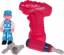 V kompletu so figurica voznika, otroški vrtalnik/izvijač in 3 izmenljivi nastavki (ravni, križni, šesterokotni) za realistično igro malega popravljalca.