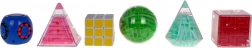 Kocka s 3D labirintom, dve piramidi z kroglico, kroglasti labirint, kroglična žoga in RUBIKOVA kocka – raznolike naloge za ure pametne zabave.
