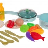 Lonec, ponev, krožniki, pribor in pester nabor živilskih dodatkov nudijo otrokom vse, kar potrebujejo za igro kuharja.