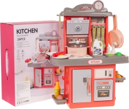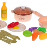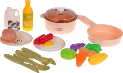 Komplet 28 delov vključuje lonec s pokrovko, ponev, krožnike, jedilni pribor in širok izbor živil. Otroci lahko po domišljiji pripravijo zajtrke, kosila in večerje.