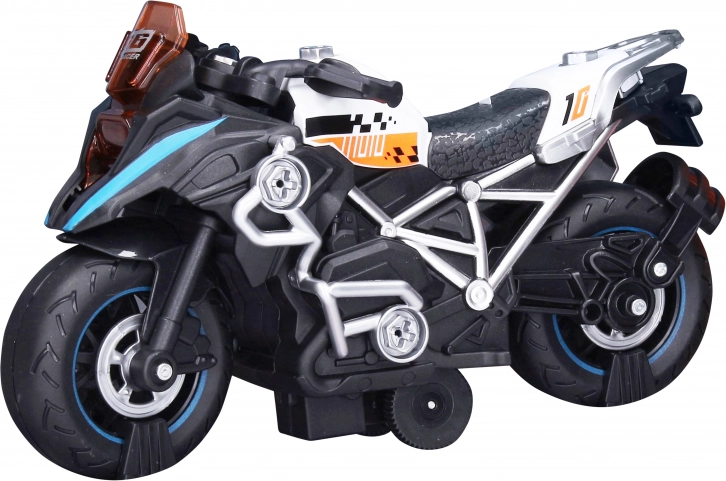 Zabaven vijačni motor z efekti v elegantni beli barvi bo navdušil male mehanike in ljubitelje motorjev. Zahvaljujoč vztrajniku se zlahka vozi, s pritiskom na zadnji del pa se aktivirajo svetlobni in zvočni učinki. V paketu je priloženo orodje za razstavljanje in sestavljanje ter baterije 3x AG13.
