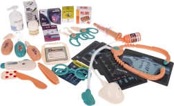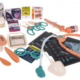 Set vsebuje različna medicinska orodja kot stetoskop, termometer, zobni ogledalec in druge.