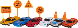V kompletu so avtomobilčki, prometni znaki in stožci – idealno za urjenje prometnih situacij in ustvarjalno igro.