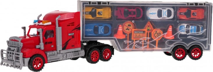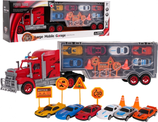 Velik set za male voznike: rdeč tovornjak z odstranljivim polpriklopnikom, ki služi kot praktičen kovček za 6 avtomobilčkov. Priloženi so tudi prometni znaki in stožci za realistično igro. Igrača je izdelana iz vzdržljivih materialov, ima žive barve in je primerna za otroke od 3 let.