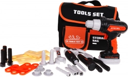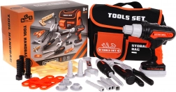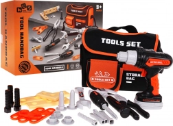 Dodelana torba ponuja glavni predal z ježkom, sprednji žepek in držala za orodje. Električni vrtalnik na 2× AA bateriji (priloženi) zna zategovati in popuščati, ima zamenljive bite in odstranljiv akumulator, zato bodo otroci doživeli pristno izkušnjo popravil in montaže.