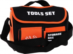 Vzdržljiva shranjevalna torba z ročajem in ramenskim trakom. Glavni predal z ježkom, sprednji žep in notranje pregrade za pregledno shranjevanje orodja.
