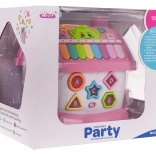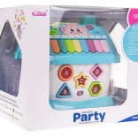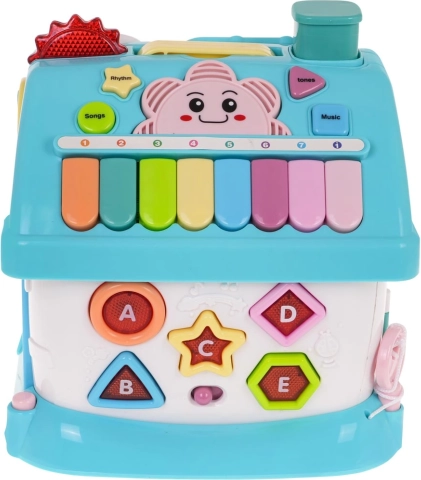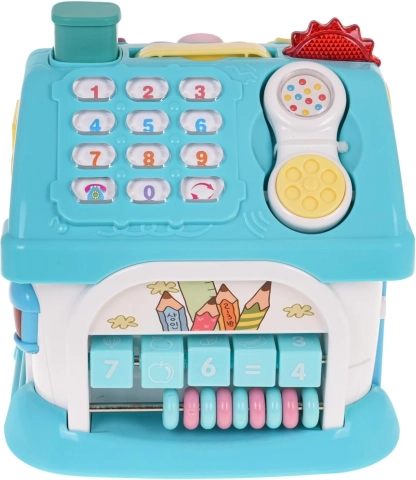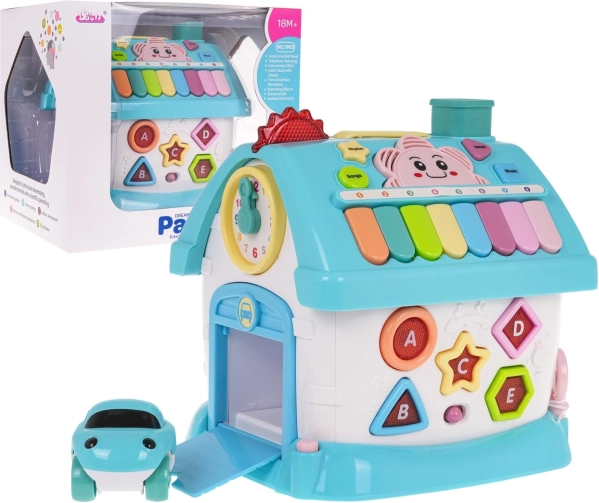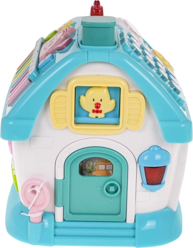 Interaktivna hišica je izdelana iz kakovostne plastike v privlačnih barvah in je zasnovana tako, da otroci na zabaven način razvijajo prepoznavanje oblik, črk in števil. Vsaka od štirih stranic ponuja različne aktivnosti – od ure z resnično premikajočimi se kazalci in garažnimi vrati, preko stranice z abecedo in osvetljenimi oblikami, do vhodnih vrat s ključem z lučmi in zvoki. Priložen je tudi majhen avtomobilček za še več igralnih scenarijev.