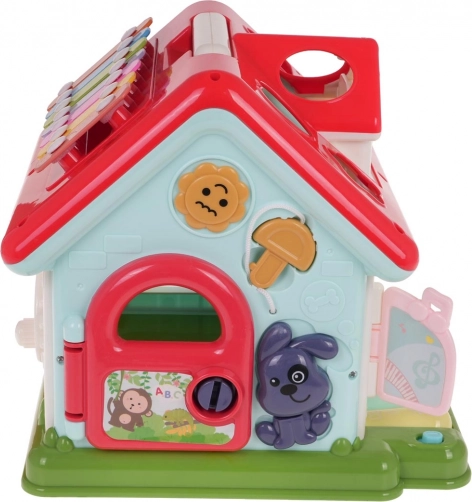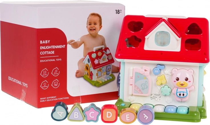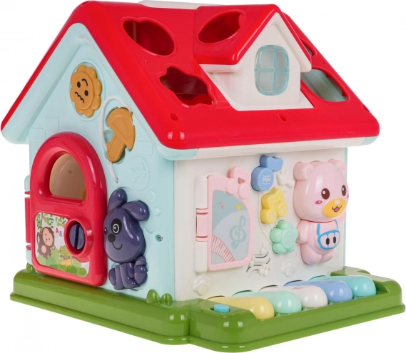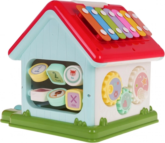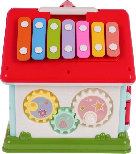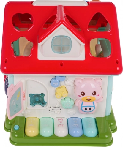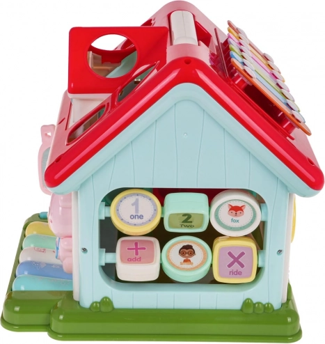 Odkrijte zabaven način, kako otroke seznaniti z glasbo, oblikami in barvami. Interaktivna hiška združuje klavirček s 5 tipkami (številke, živali in njihovi zvoki, melodije, toni Do–So), svetlobno okence in govoreče/igralne elemente z živalicami. Vsaka stena ponuja drugo aktivnost – od vratc na ključ do zobnikov in vrtljivih kock s črkami.