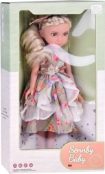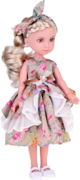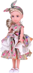 Ta očarljiva punčka je popolna izbira za vsako malo ljubiteljico mode. Z dolgimi blond lasmi, spletenimi v eleganten kito, je oblečena v elegantno cvetlično obleko z volančki, ki jo dopolnjujeta cvetlični naglavni trak in beli čeveljčki. Celoten slog je preprosto osupljiv!