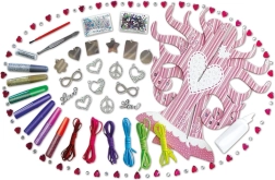 Ta celovit likovni komplet je idealen za male navdušenke nad okraševanjem in vse otroke, ki radi ustvarjajo in nosijo svoj nakit. V paketu najdete vse potrebno – od kovinskih obeskov in sintetičnih vrvic do kamenčkov, bleščic, lepila in praktičnega kartonastega »drevca za nakit« za razstavljanje končanih okraskov.
