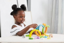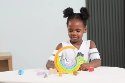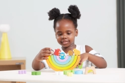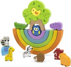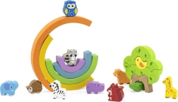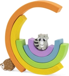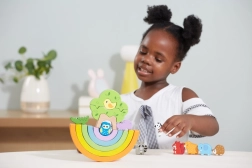 Ta montessori set združuje veselje ob zlaganju mavrice s fantazijo pri igri s prikupnimi živalicami. Otroci lahko plastijo barvite loke, ustvarjajo tunele in mostove, gradijo okolje za živalice ter raziskujejo, kako deluje uravnavanje ravnotežja in stabilnost. Igra naravno razvija fino motoriko, senzorično zaznavanje in kreativnost.