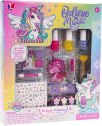 Čarobni komplet za nohte in ličenje z motivom samoroga bo razveselil vsako malo navihanko od 3 let dalje. Vsebuje bleščeče lake za nohte, senčila za oči s čopičem, glos za ustnice v škatlici v obliki samoroga, nalepke za nohte, pilico, separator prstov, aplikator z bleščicami in šminko. Vsi kozmetični izdelki so varni za otroke in zlahka pralni.