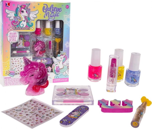 Vsebina pakiranja: 3× bleščeč lak za nohte, šminka, aplikator z bleščicami, pilica za nohte s samorogom, separator prstov, paleta senčil za oči (6 barv) s čopičem, glos za ustnice v škatlici v obliki samoroga, dekorativne nalepke za nohte.