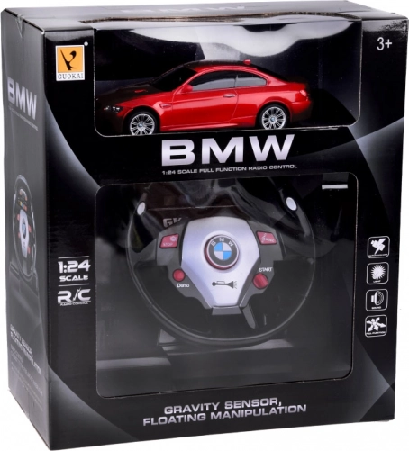 Licenčni RC avto BMW v merilu 1:24 navduši z verodostojnimi detajli karoserije, zadnjim pogonom in lučmi, ki svetijo pri vožnji naprej in nazaj. Del kompleta je volan s funkcijami START/STOP, DEMO in MUSIC, ki simulira pravo vožnjo, vključno z zvoki smernikov pri zavijanju. Zahvaljujoč priseskom trdno stoji na mizi, izbira prestav (N, D1, D2, R) pa vožnji doda še bolj realističen značaj.