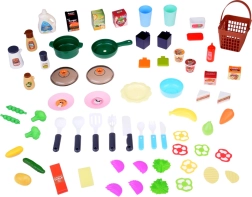 Kuhinja vključuje komplet posode, loncev, umetnih in igračarskih živil, med drugim koš za zelenjavo in dodatke za sortiranje.