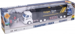 Uživajte v realistični vožnji s črnim tovornjakom na daljinsko upravljanje, ki z frekvenco 27 MHz zagotavlja stabilno upravljanje ter svetlobne učinke za več zabave. Kompaktne mere 41 × 11,5 × 6,5 cm so primerne za vsako otroško sobo in tudi za na pot.