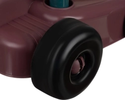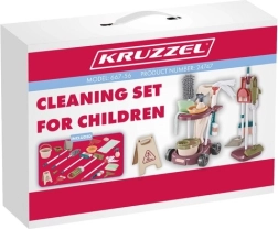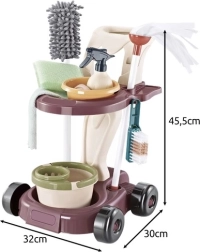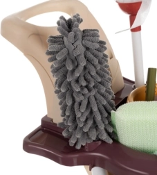 Voziček z ergonomsko ročico - voziček na štirih širokih kolesih, izdelan iz visokokakovostne PP plastike, je zasnovan za enostavno manevriranje. Ergonomski širok ročaj otrokom olajša upravljanje vozička tudi med igro na poti. Na dveh policah je mogoče namestiti različne elemente kompleta: vedro s cedilom za mop na spodnjo polico ter posodo, podlogo, ožemalnik in posodico za milo na zgornjo polico. Zahvaljujoč posebnim odprtinam je mogoče v voziček postaviti okroglo metlico za brisanje prahu, gobico in mop, kar omogoča enostaven dostop do vseh orodij. Na straneh vozička sta dva kljukica za obešanje mikrokrp.