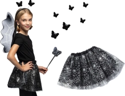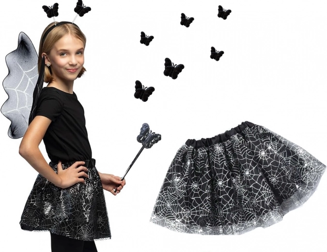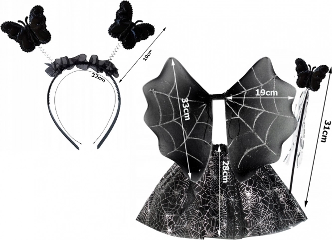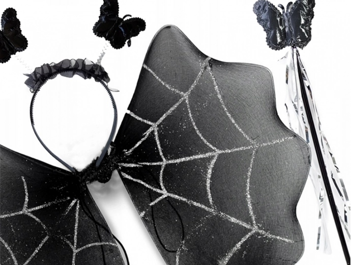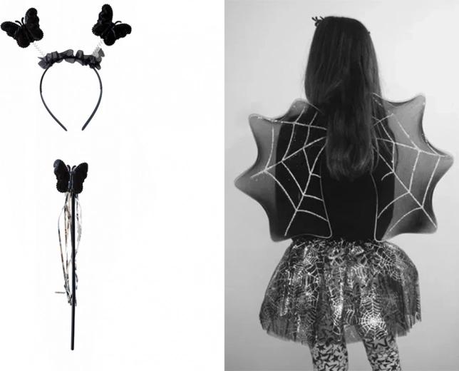 Ta halloweenski kostum za otroke združuje očarljiv videz in udobje. Črno tilasto krilce s srebrnim potiskom pajčevine se lepo blešči, lahka krila na elastiki se enostavno namestijo, obroč z metulji na vzmetkah pa celotnemu preoblečenemu videzu doda igriv učinek. Vse je izdelano iz lahke poliestrske tkanine, ki ne ovira gibanja.