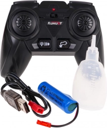 Daljinsko upravljanje 2,4 GHz omogoča gladko vodenje naprej, nazaj, desno in levo brez motenj. Vgrajen polnilni akumulator 3,7 V 500 mAh zagotavlja dovolj energije za igro, polnjenje poteka prek USB. Učinek dima aktivirate s priloženo stekleničko za vodo za še bolj realistično izkušnjo.