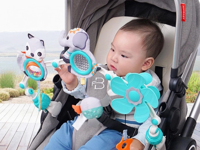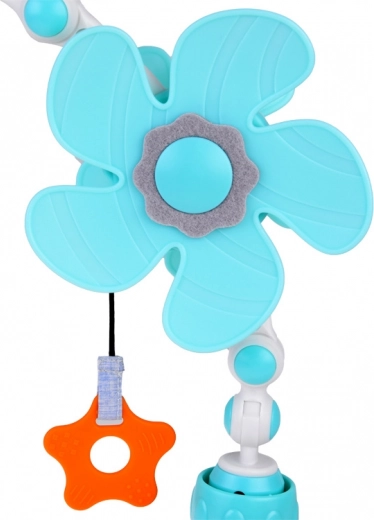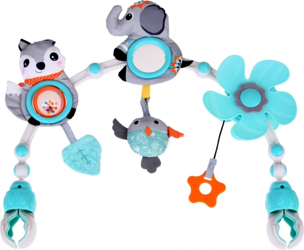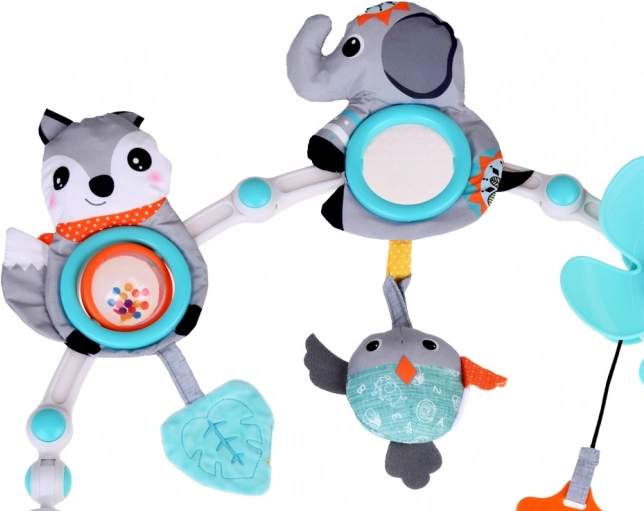 Slonček s šumečimi elementi in ogledalcem, ptiček kot zanimiv element za dojenčke ter cvet-vetrnica, ki jo lahko sprožite s potegom za oranžno zvezdo.
