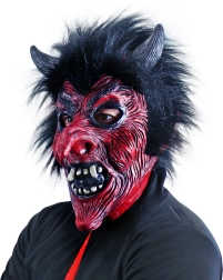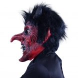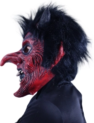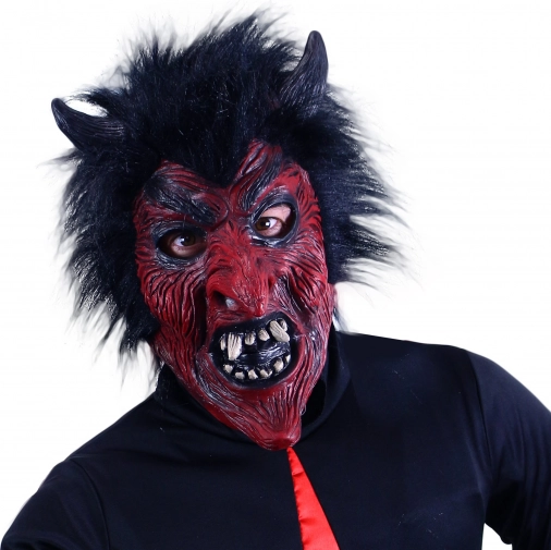 Ta dovršeno izdelana maska hudiča prekrije celoten obraz in z združitvijo izrazitih potez, rogate zasnove ter sintetičnih črnih las ustvari resnično srhljiv učinek. Izdelana je iz prožnega lateksa za udobno nošenje in stabilno prileganje.